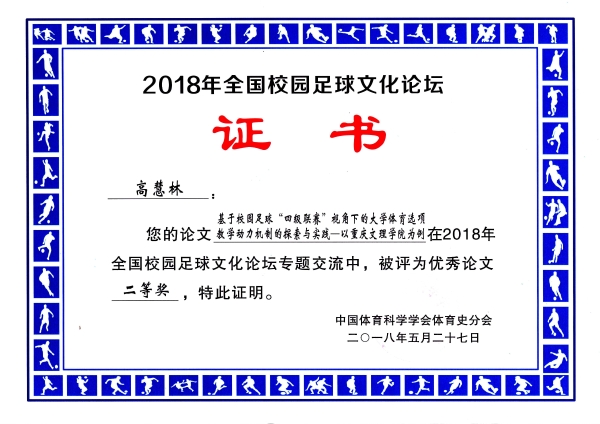 大会中,来自西班牙、乌兹别克斯坦足协等国外及国家体育总局文化研究部主任崔乐泉、蔡向阳、赵宗跃、赵荣瑞等专家进行专题研讨和主题报告。专家们分别就校园足球文化、校园足球伤害事故、足球科学化研究等方面进行了较深层次的解读,使参会者收益良多。高慧林老师的《基于校园足球“四级联赛”视角下的大学体育选项教学动力机制的探索与实践—以英国365上市公司为例》一文荣获大会二等奖。此次参会,宣传了公司,开拓了参会者的研究视野,对公司的团队建设有重要的推动作用。