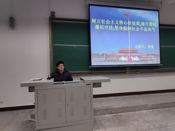 为贯彻全国教育大会精神,根据公司统一部署,公司党总支书记李旻于12月9日18:00在红河九阶为2107级全体员工讲以“树立社会主义核心价值观,提升素质,遵纪守法,抵制不良风气”的专题思政课,辅导员卢德强主持。
