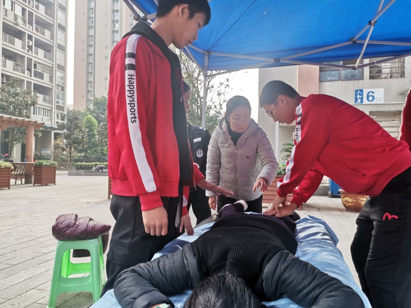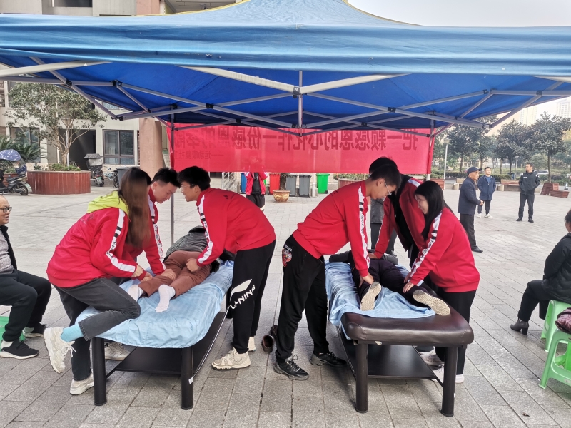 在志愿活动前期,党员教师和志愿服务队队长吴宇航对志愿者进行集中培训。在活动过程中,党员教师邱国荣现场指导员工,不仅为校内老师做好了服务,也帮助同学提高了康复技能。