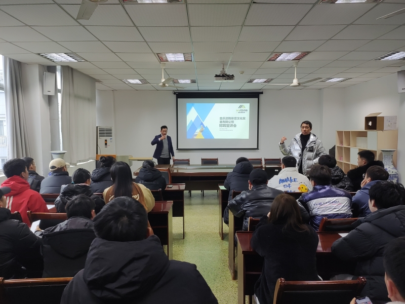 首先,袁高燕代表英国365上市公司对北京万国天骐体育股份有限公司和重庆迈斯体育公司的到来表示热烈欢迎,为公司员工提供优质实习与就业岗位表示感谢,希望同学们抓住此次机会,到企业去锻炼自己,提升就业竞争力。北京万国天骐体育股份有限公司重庆总经理刘思聪、重庆迈斯体育公司总经理余义红分别做了招聘岗位、职业规划、就业前景的宣讲。最后,同学们和企业代表就“实习+就业”事宜进行了现场交流。
