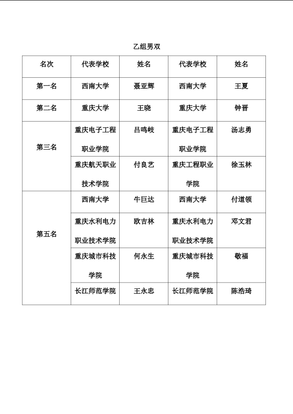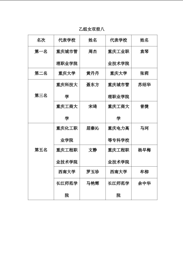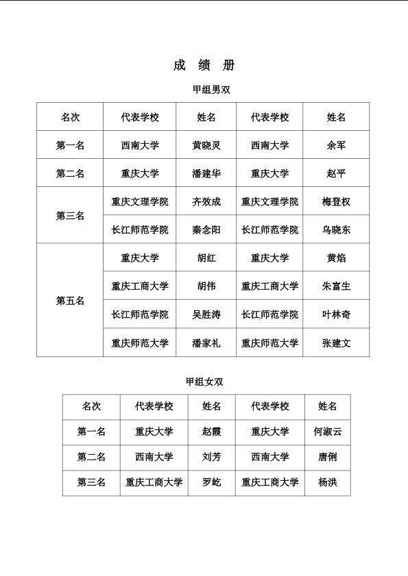 重庆市第十一届普通高校教师网球比赛成绩册