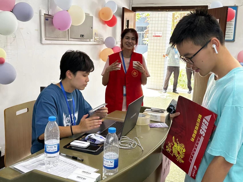 公司迎新工作人员热情接待每一位新同学,及时与报到的新生进行沟通,耐心解答他们的疑问,积极主动地引导每一位新生顺利办理入学手续、入住手续。
